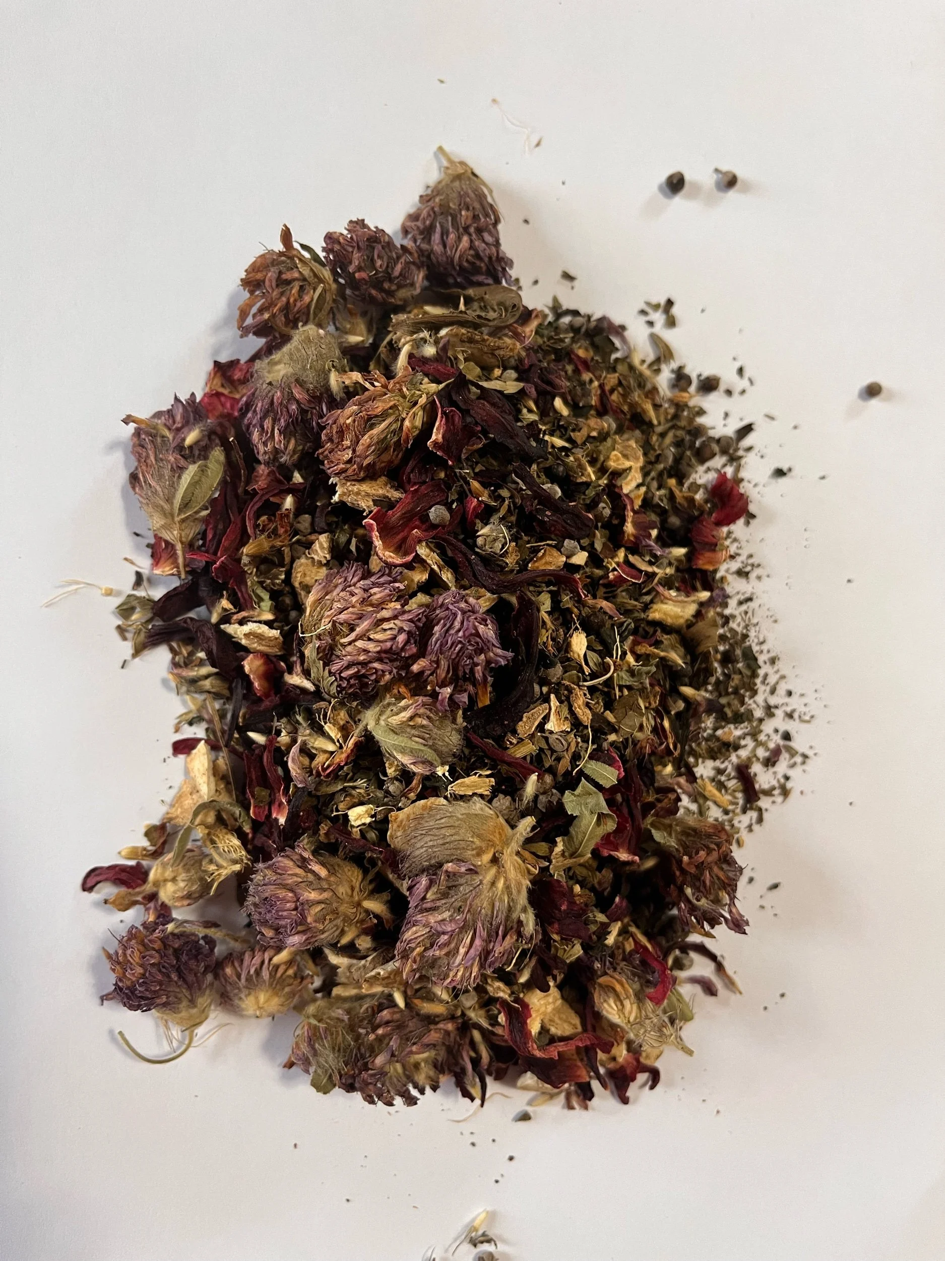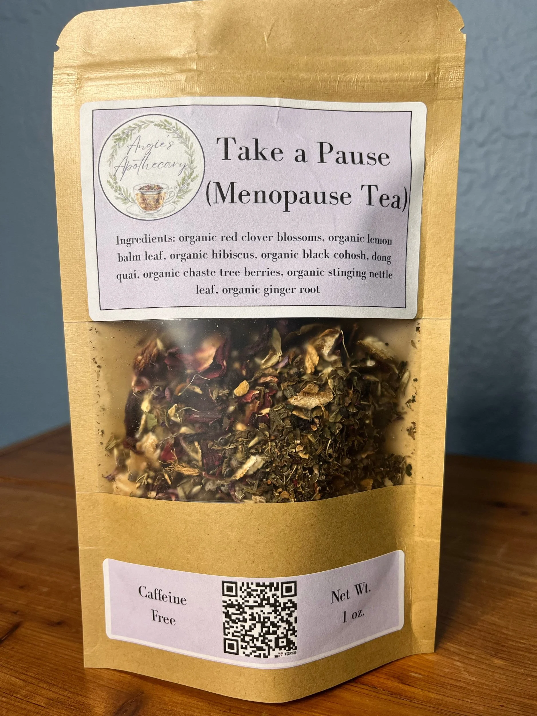 The Take a Pause - Menopause Tea was created to help quiet the symptoms, using herbs known for assisting the body as it goes through “the change.” (Please discuss with your doctor before starting new herbs, especially if you are on medication or being treated for any medical issues. Herbs may interact with medications.)